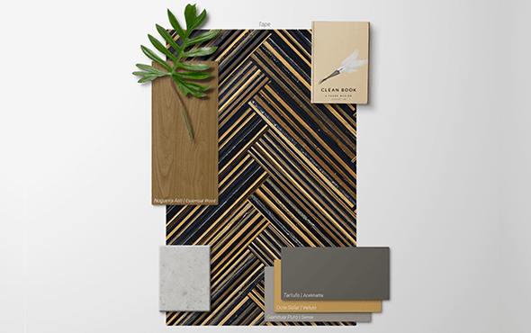 Criado por Sig Bergamin e Murilo Lomas, o padrão Tape é uma celebração à memória afetiva e à inovação no design de interiores. Inspirados pela ideia de recriar um padrão de madeira que não é madeira, com um toque inovador, os designers buscaram referências nas icônicas fitas cassete que faziam parte dos lares brasileiros. Essas fitas, com seus tons terrosos e texturas características, foram ressignificadas em uma proposta contemporânea e sofisticada. A paginação em escama de peixe traz dinamismo e movimento ao design.