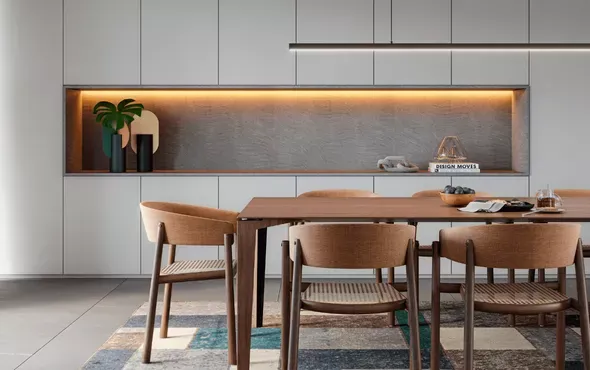 Da Linha Design, o padrão Nogueira Flórida é inspirado nos desenhos de catedrais, retratando um aspecto mais rústico aliado à tonalidade de madeira moderna. Como resultado, os ambientes apresentam um ar mais tranquilo e convidativo.