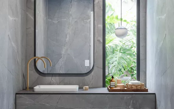 O padrão Quartzo Bienna, da Linha Velluto, surpreende por suas cores, veios e desenhos. Cada detalhe confere naturalidade e personalidade a projetos autênticos.