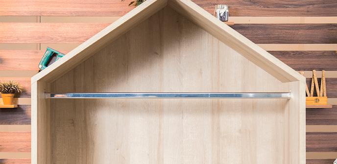 Instale a barra de metal a 100 centímetros da última prateleira. Use suportes pra facilitar. Essa barra será a arara do armário.