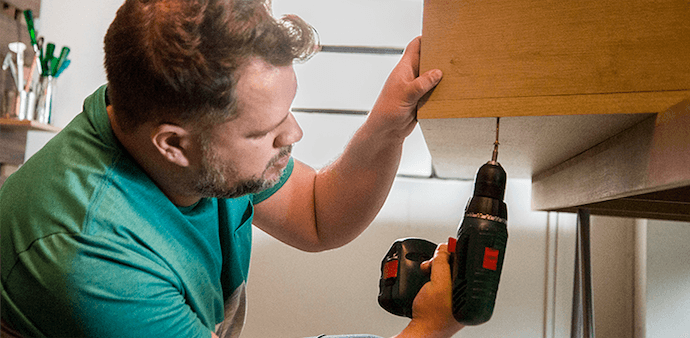 Alinhe uma das partes do telhado da casinha com o fundo do armário e fixe o parafuso com auxílio da parafusadeira.