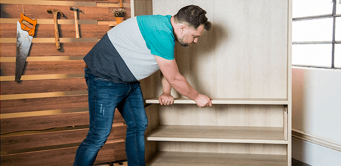 Usando as divisórias do gaveteiro como medida, fixe as duas prateleiras.