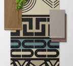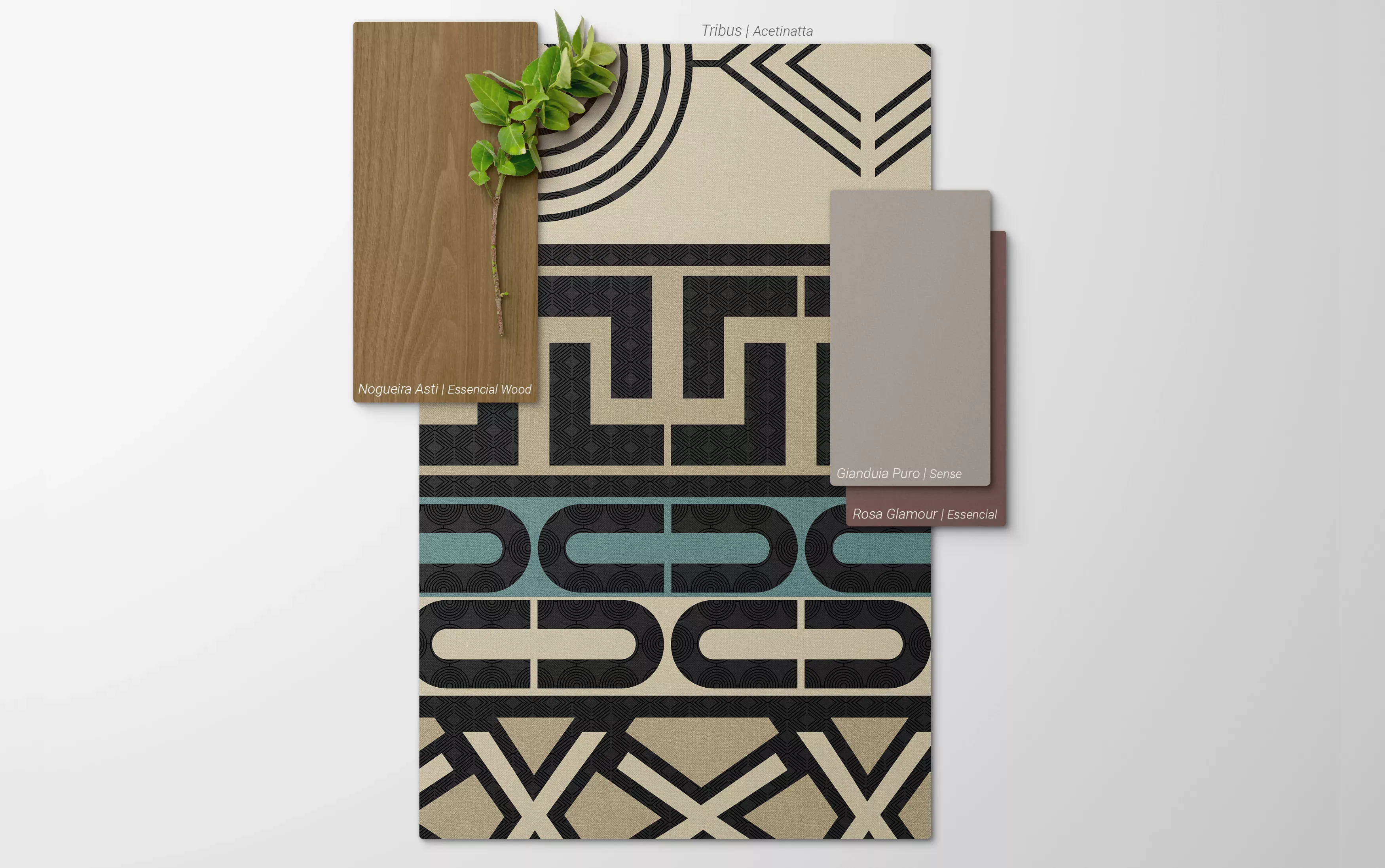Idealizado pela arquiteta Denise Zuba, o padrão é inspirado em grafismos tribais, realçado por cores que são tendência em 2024 e que são também atemporais, remetendo a água e terra.